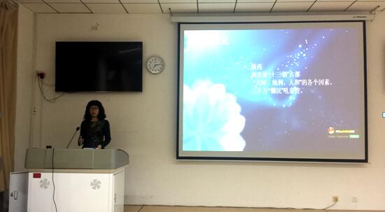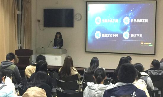 接着,戴玉霞教授向同学们进一步解释了中西方文化在哲学根源上以及思维方法两方面的差异。在谈到哲学根源时,她强调,东方人好曲线,重整体,偏模糊,喜中庸;西方人则好直线,重解析,偏精确,喜偏激。在思维方法上,西方文化多见于形式分析、开门见山、突出主观作用并以主题为中心;东方文化则注重整体把握、委婉含蓄、从实际出发,注重主客体之间的融合。