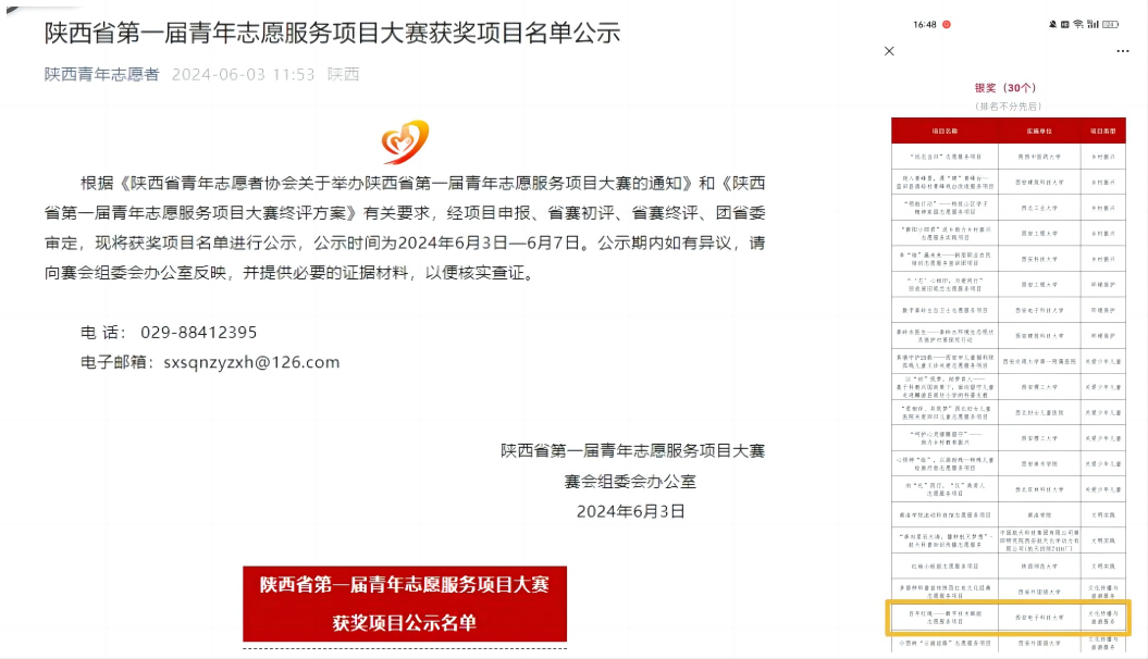 (通讯员:赵璐)近日,陕西省第一届青年志愿服务项目大赛结果公布,由威廉希尔足球团委申报的《百年红魂——数字技术赋能志愿服务》项目获银奖,项目负责人为公司孔庆钰同学。